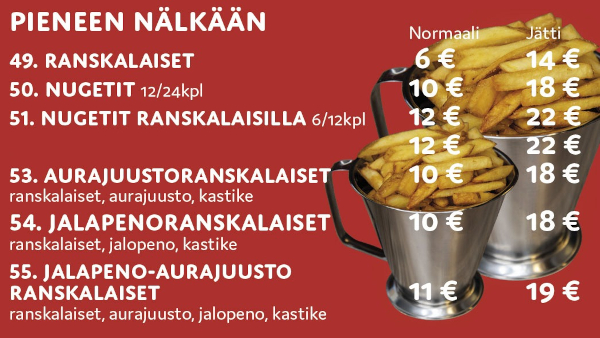 Lounasbuffet arkisin ma-pe klo 10-14. Lounas sisältää salaattipöydän, kebabia, döneriä ja pizzaa. Juoma ja kahvi sisältyy myös hintaan.