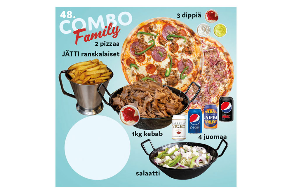 1 kg kebablihaa + kebab-kastike, kaksi vapaavalintaista pizzaa, JÄTTIranskalaiset, kolme dippiä ja neljä juomaa.